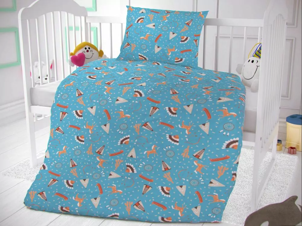 Když povlečení pro nejmenší, tak jedině bavlněné a příjemné, které zajistí pohodlný a kvalitní spánek. Dětské povlečení je vyrobeno z velmi jemné tkaniny s vysokou hustotou jemných přízí. Bavlněné povlečení Indiánská vesnička rázem přenese Vaše zlatíčko do indiánské rezervace. Kombinace roztomilých motivů v přírodních tónech a modrého podkladu jistě ozdobí každý chlapecký pokojíček.