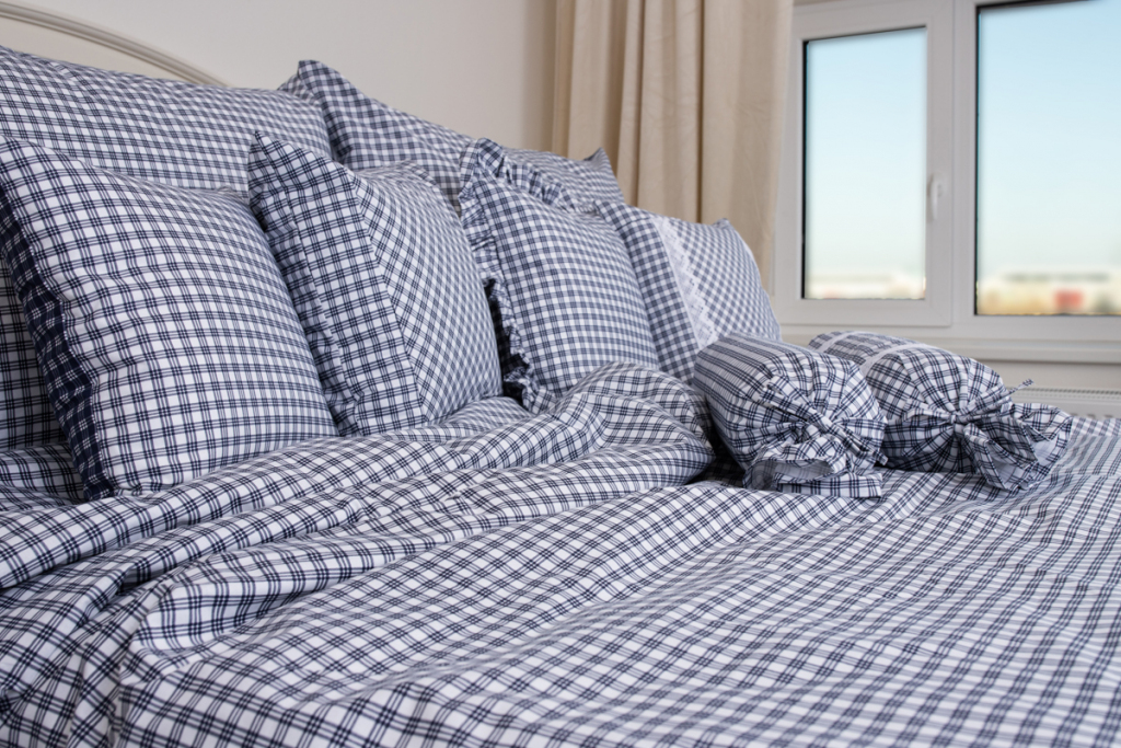 Prošívaný přehoz kostičkovaný v barvě modro-bílé.