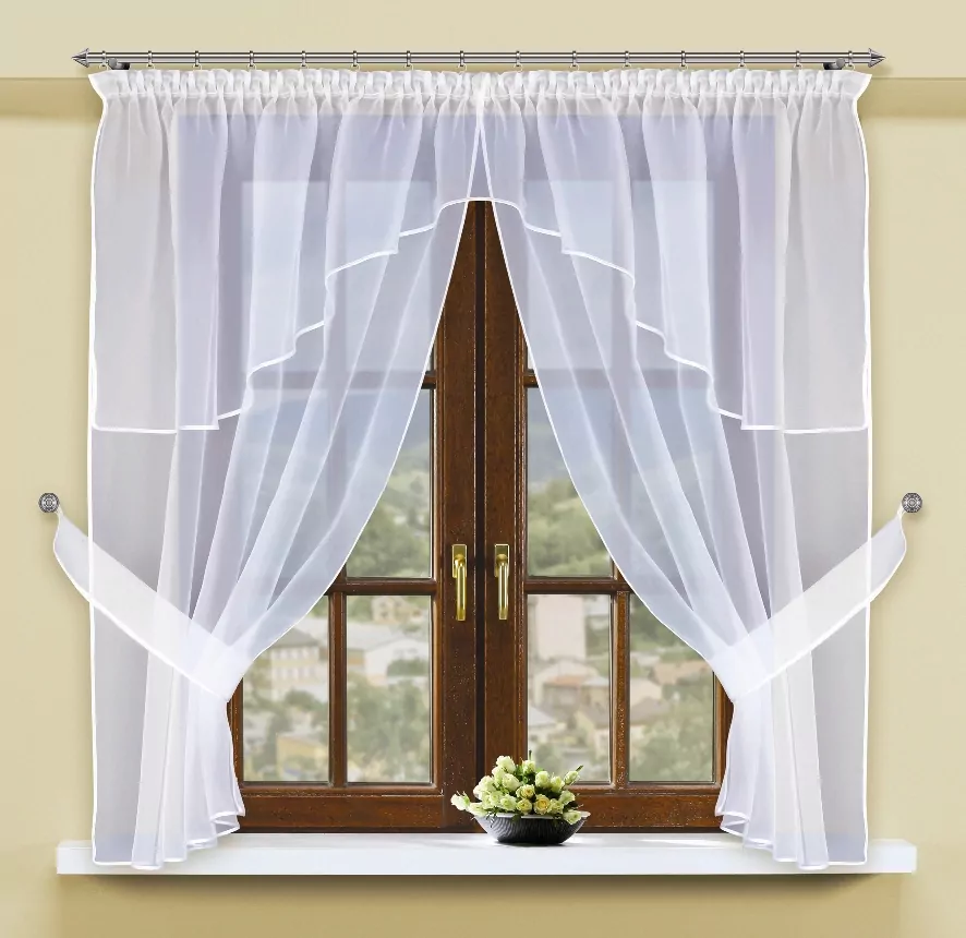 Kusová voálová záclona Karin je opatřena variabilní řasící stuhou. Moderní záclona Karin je vyrobena z bíleho voálu. Zajimavě řešený střih umožní vyniknout dekoracím na parapetu. Záclona je lemovaná šikmým proužkem.