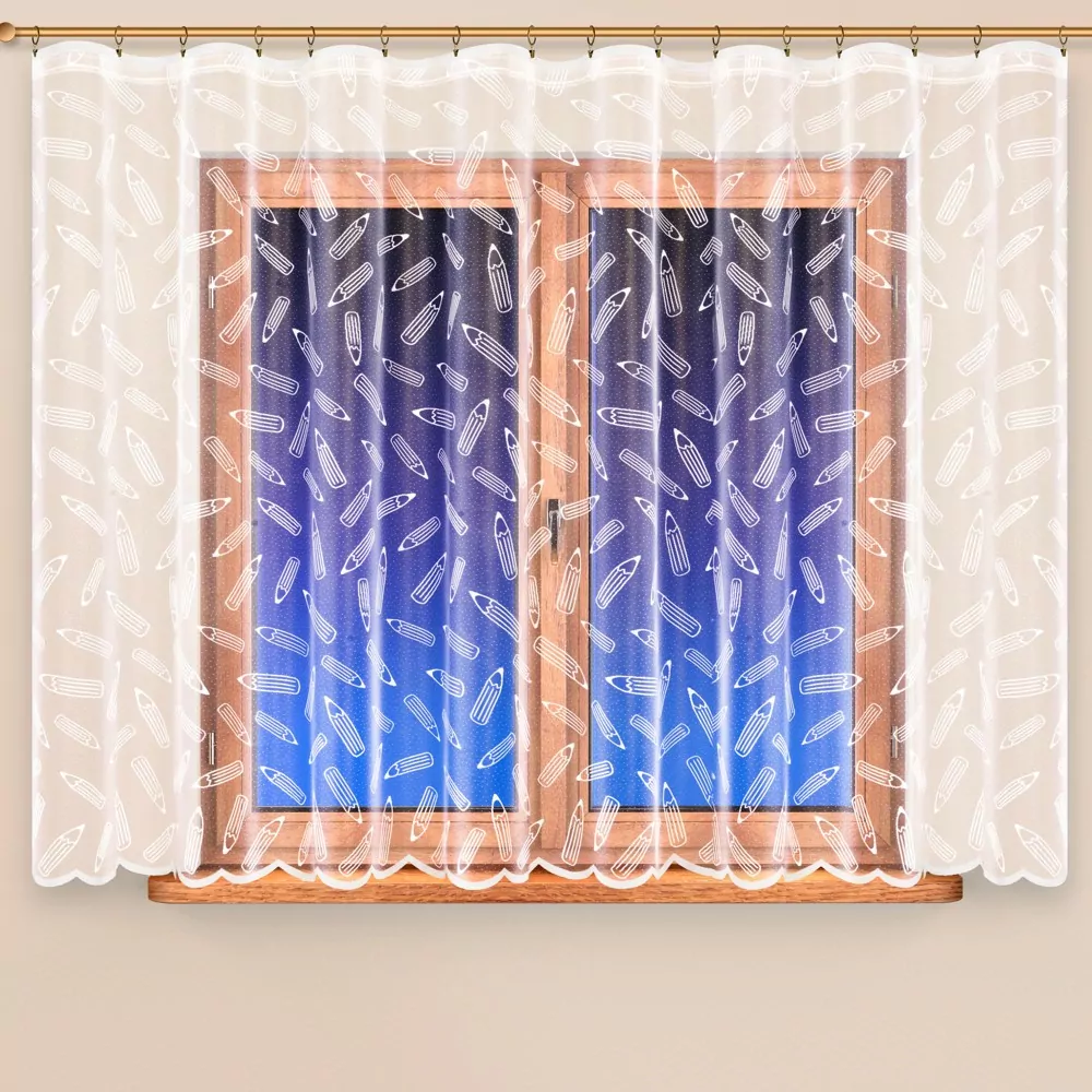 Roztomilá záclona s motivem tužek. Žakárová záclona v bílé barvě s celoplošným vzorem. Záclona Tužky je díky svému vzoru vhodná do dětských pokojů pro děti předškolního a školního věku. Tuto záclonu máme v nabídce ve více výškách, a to i jako balkonový set. Pro kvalitní nařasení záclony, doporučujeme nechat si našít řasící stuhu.