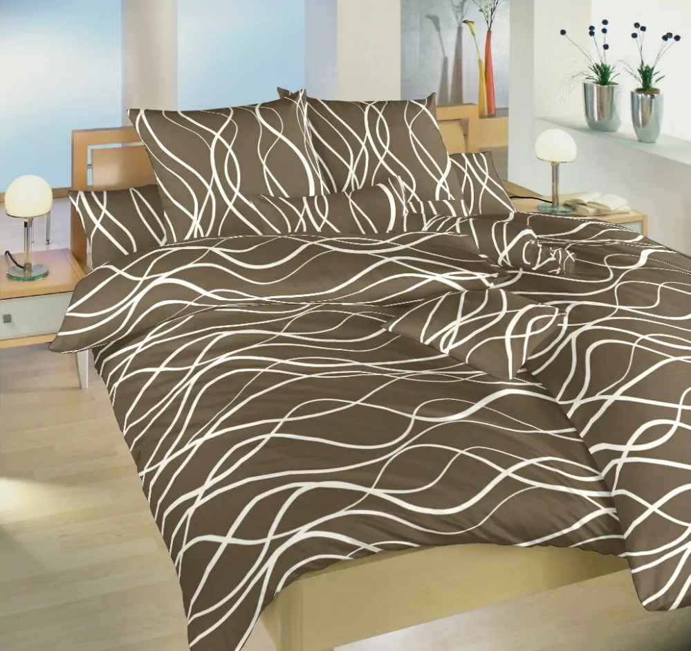 Luxusní bavlněné povlečení s jemným motivem vlnek v banánových tónech na tmavě hnědém podkladu.