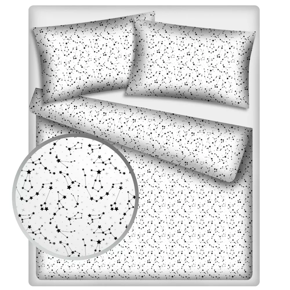 Luxusní povlečení ze 100% měkčené bavlny. Materiál ve velmi vysoké jakosti, bavlna je jemná a hladká. Povlečení zdobí jemný astrologický motiv souhvězdí v černé barvě na bílém podkladu. Povlečení je opatřeno oblíbeným zipovým uzávěrem, který doporučujeme při praní uzavřít.