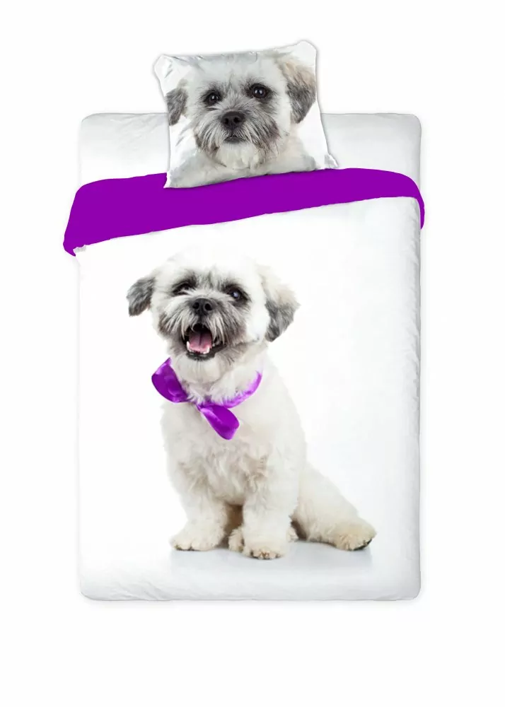 Povlečení ze 100% bavlny se zvířecím motivem. Materiál ve velmi vysoké jakosti, bavlna je jemná a hladká. Na povlečení je tištěn bílý pejsek, druhá strana je jednobarevná bez motivu. Povlečení je tištěno moderním a kvalitním digitálním tiskem. Perte z rubové strany s uzavřeným zipovým uzávěrem.