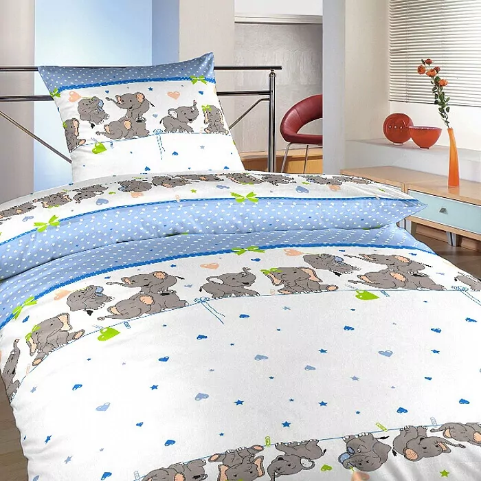 Krepové povlečení do dětské postýlky s motivem sloníků laděné do modré barvy. Povlečení je vhodné kombinovat s bílým, denim nebo šedým prostěradlem.