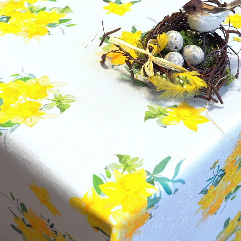 Tefonový ubrus s jarním motivem narcisů.