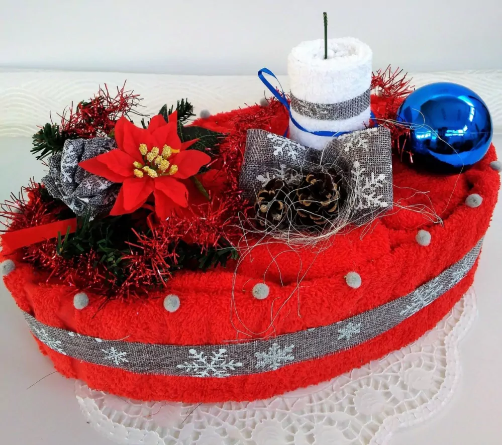 Textilní dort obsahuje: 1ks ručník 50x100 cm červený, 1ks ručník 30x50 cm bílá.