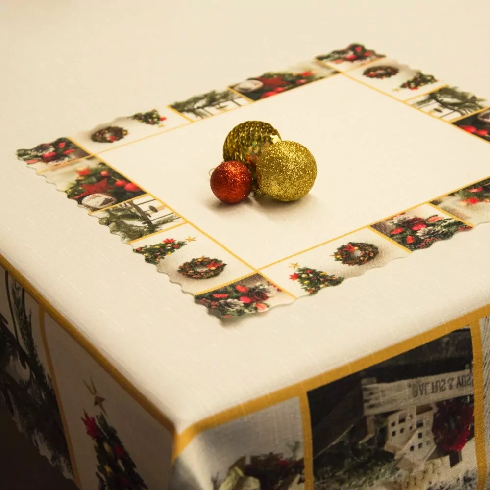 Vánoční polyesterové ubrusy s teflonovou úpravou a digitální potiskem. Celoplošné ubrusy s vánočními motivy. Teflonové ubrusy nesají žádné tekutiny, tedy ani kávu, čaj nebo víno. Vylitá tekutina zůstává na povrchu teflonové látky a lze ji jednoduše setřít ubrouskem či utěrkou. Nevztahuje se však na mastnotu. Okraje ubrusu jsou opalovány do ozdobných vlnek. Tyto ubrusy dodají skvělou a jedinečnou vánoční atmosféru.