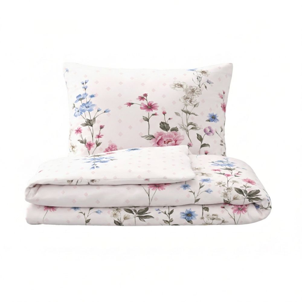 Romantické bavlněné povlečení LOUKA přináší do ložnice svěžest rozkvetlé louky. Jemné růžové kvítí na bílém podkladu doplněné většími růžovými a modrými květy působí lehce, elegantně a nadčasově. Skvěle se hodí do světlých i romanticky laděných interiérů.