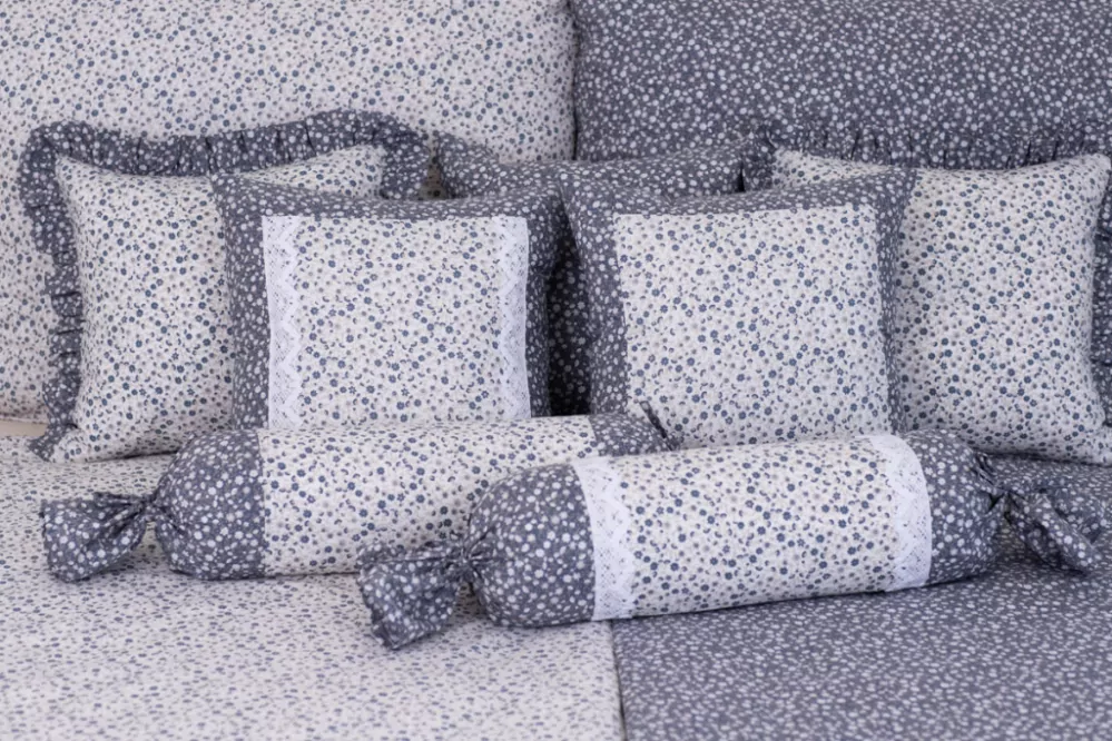 Kombinovaný povlak s drobným kvítkem v jeans barvě, prošitý s krajkou.