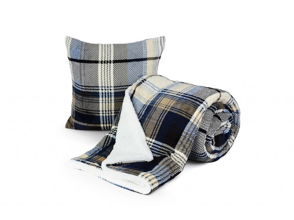 Hebká deka BERÁNEK se vzorem modrého kára + povlak 40 × 40 cm ve stejném dezénu zdarma