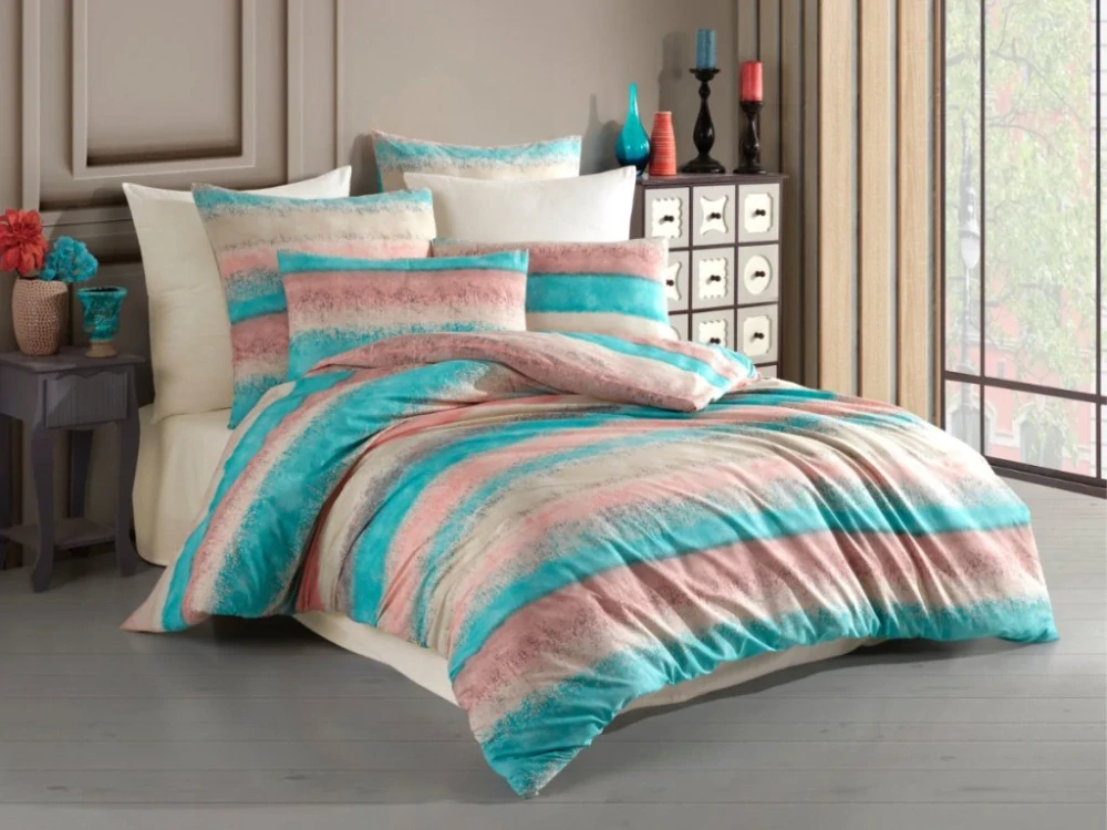 Toto flanelové povlečení zaujme výrazným moderním designem s horizontálními pruhy v sytých odstínech tyrkysové, růžové, béžové a hnědé. Jemně strukturovaný, lehce malířský vzhled připomínající tahy štětcem nebo akvarelový efekt dodává povlečení originalitu a jedinečný charakter.