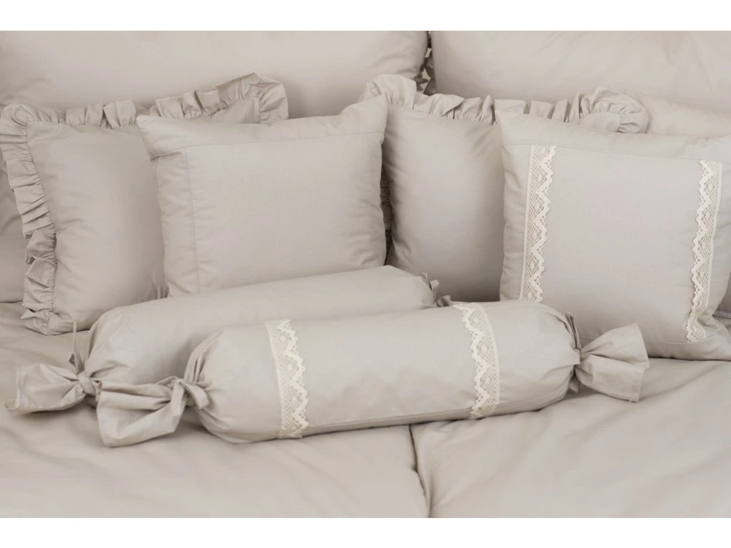 Dekorativní válcovitý povlak doplněný jemnou krajkou dodá ložnici romantický a elegantní vzhled.