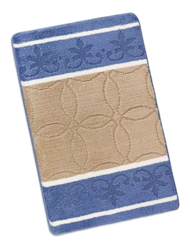 Koupelnová předložka v béžové a modré barvě, která se skvěle hodí do různých typů koupelen. Latexový nátěr na rubu vytváří povrch s protiskluzovými vlastnostmi, který zajišťuje bezpečnost na koupelnové podlaze tím, že minimalizuje riziko uklouznutí. Pro zachování kvality doporučujeme prát při teplotě 30°C a bez použití avivážních prostředků.