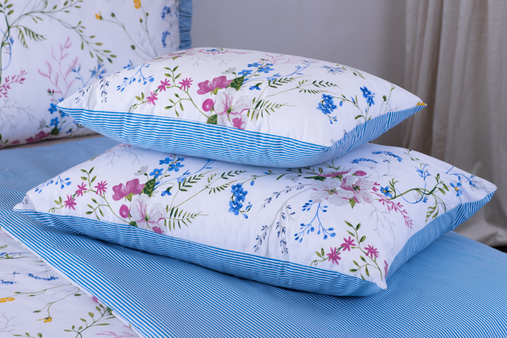 Oboustranný krepový povlak na polštář – luční kvítí a modré proužky.