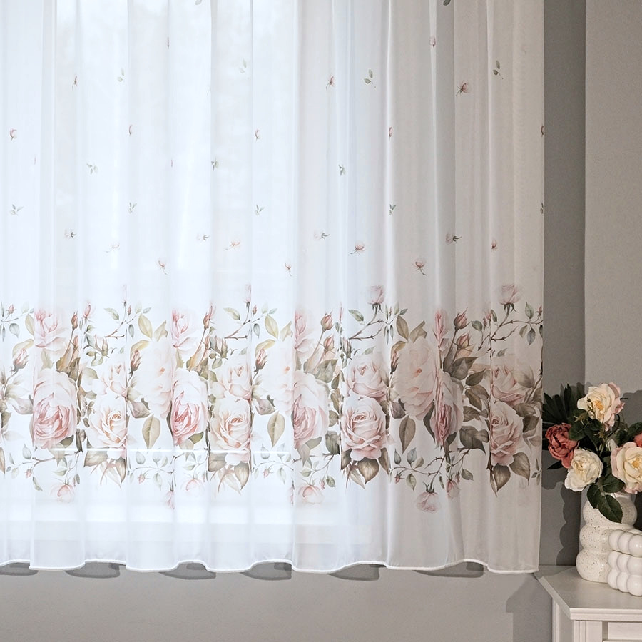 - Design: bílá záclona s moderním vzorem romantických růží.