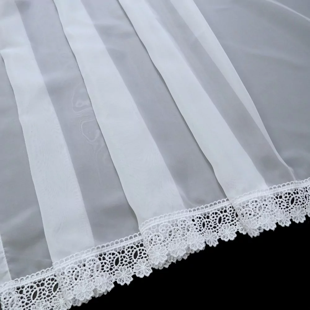 Kusová záclona Agáta ušitá z bílého hladkého voálu, který je na spodní části lemován elegantní krajkou o šíři 6 cm. Tato voálová záclona se dá skvěle kombinovat s různými vzorovanými závěsy a doplňky. Díky svému elegantnímu vzhledu se hodí do každého interiéru. Jelikož je pouze v kratších výškách, je vhodná do kuchyňských či menších oken. Na vrchním okraji je záclona opatřena řasící stuhou s pravidelnými sklady 1:2, které dodají zácloně luxusní vzhled. Záclona je v prodeji ve dvou výškách 60 a 90 cm.