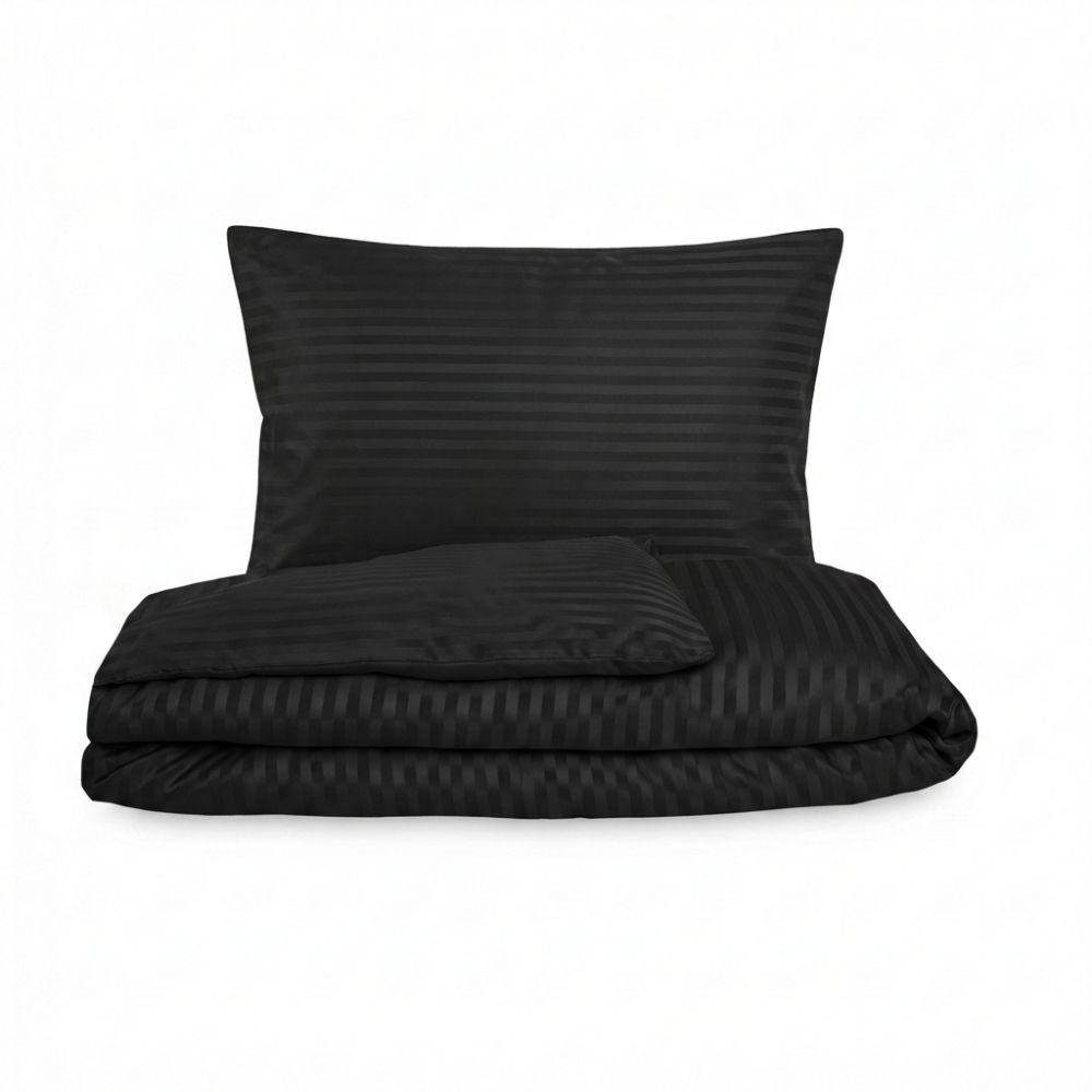 Kvalitní saténové povlečení z 100% bavlny je charakteristické jemnými vodorovnými proužky o šíři 1 cm, které jsou vytvořeny speciální atlasovou vazbou. Díky hustě tkanému materiálu je povlečení velmi jemné na dotek, prodyšné a zároveň odolné. Decentní lesk dodává ložnici luxusní vzhled, zatímco černá barva se snadno kombinuje s přírodními doplňky.