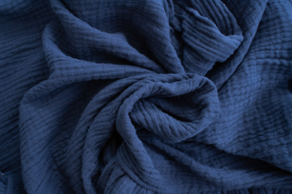 Mušelínová metráž v tmavě modré barvě přináší nebeský komfort a božskou jemnost do vašich šicích projektů. S materiálem vyrobeným ze 100% bavlny - mušelínu, si můžete užít vzdušný luxus ve vašich vlastních tvorbách. Mušelín je známý pro svou lehkost a jemnost, která se s každým praním ještě zvyšuje, čímž poskytuje stále měkčí dotek.