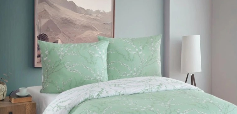 Oboustranný povlak na polštář s motivem drobných větviček a bílých kvítků vnese do vaší ložnice svěžest a harmonii. Z jedné strany má uklidňující světle zelený podklad, z druhé čistě bílý se vzorem větviček – během okamžiku tak změníte vzhled postele podle nálady.