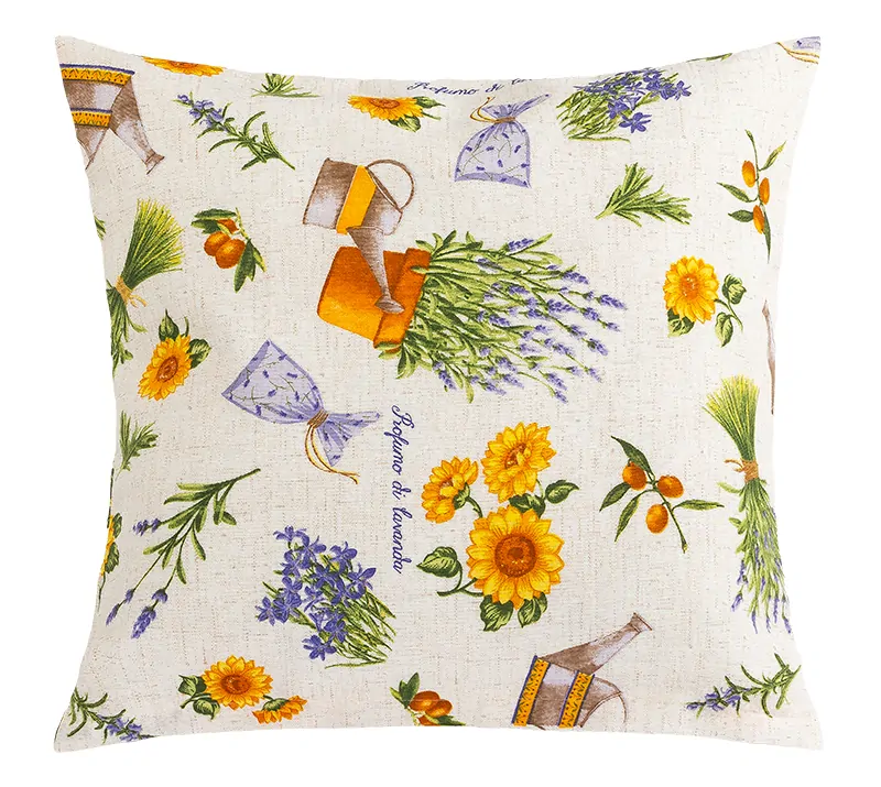 Povlak na polštářek se vzorem levandule a slunečnice.