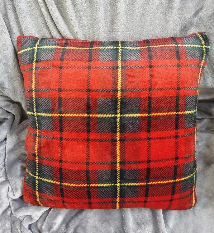 Polštářek z mikroflanelu KÁRO červené, kombinace červené, šedé, zelené a žluté barvy.