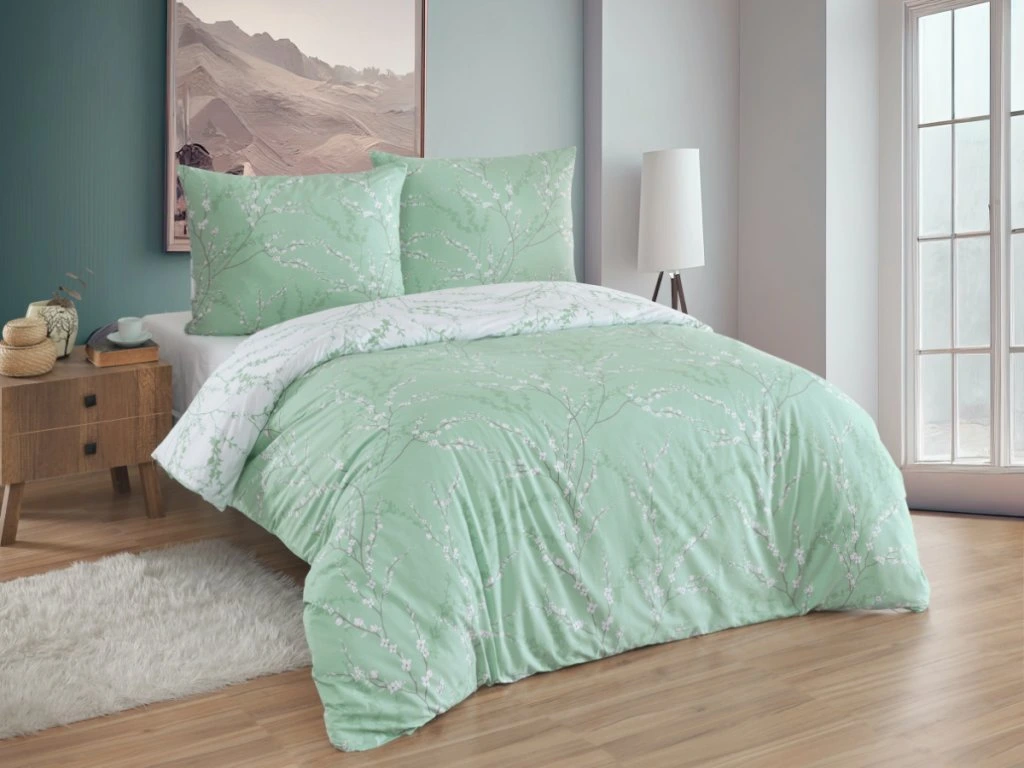 Oboustranné povlečení s motivem drobných větviček a bílých kvítků vnese do vaší ložnice svěžest a harmonii. Z jedné strany zdobí uklidňující světle zelený podklad, z druhé čistě bílý s větvičkami – během chvilky tak změníte vzhled postele podle nálady či ročního období.