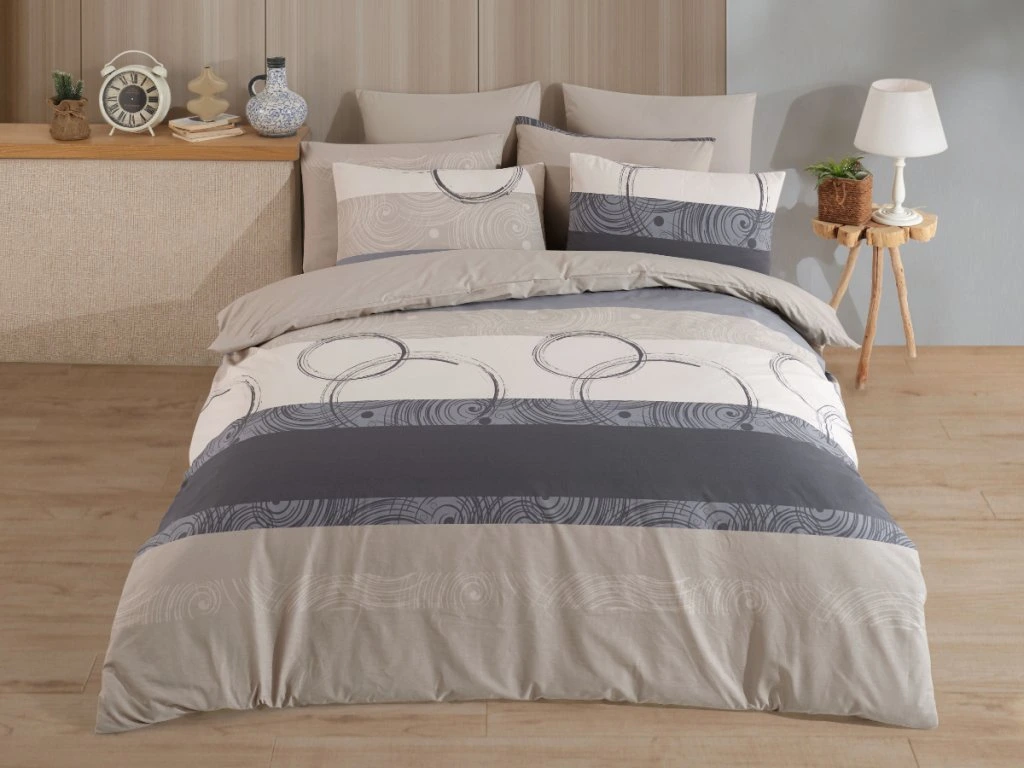 Toto povlečení zaujme svým moderním a nadčasovým designem, který kombinuje vodorovné pruhy v harmonických odstínech šedobéžové, smetanové, světle i tmavě šedé. Jemné geometrické motivy – soustředné kružnice, vlnovky a tečkované linie – dodávají vzoru vizuální hloubku a decentní dynamiku.