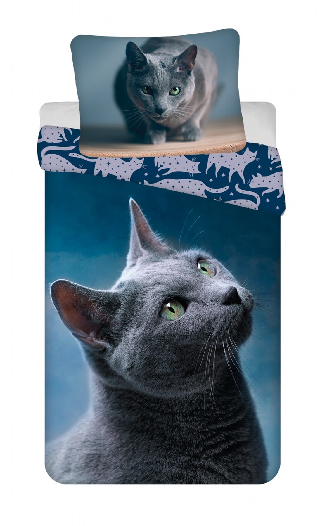 Vneste do své ložnice eleganci, klid a trochu tajemna s povlečením Kočka, které zaujme každého milovníka kočičích mazlíčků. Realistický portrét šedé kočky s pronikavýma zelenýma očima na polštáři a velký obrázek kočky na přikrývce vytvářejí jedinečný a sofistikovaný design. Okraje přikrývky zdobí moderní vzor siluet koček na tmavě modrém podkladu, který působí vkusně a originálně.