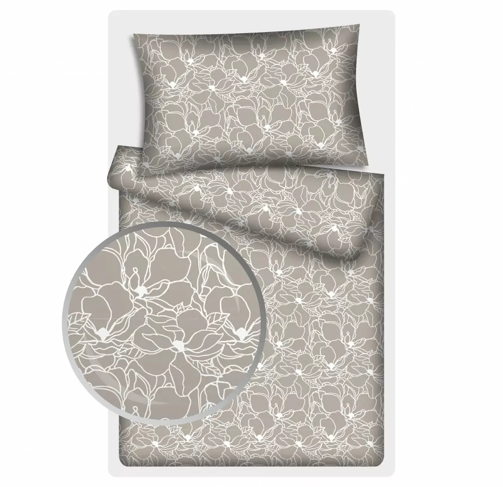 Luxusní povlečení ze 100% měkčené bavlny. Materiál ve velmi vysoké jakosti, bavlna je jemná a hladká. Povlečení zdobí bílý floristický vzor na béžovém podkladu.