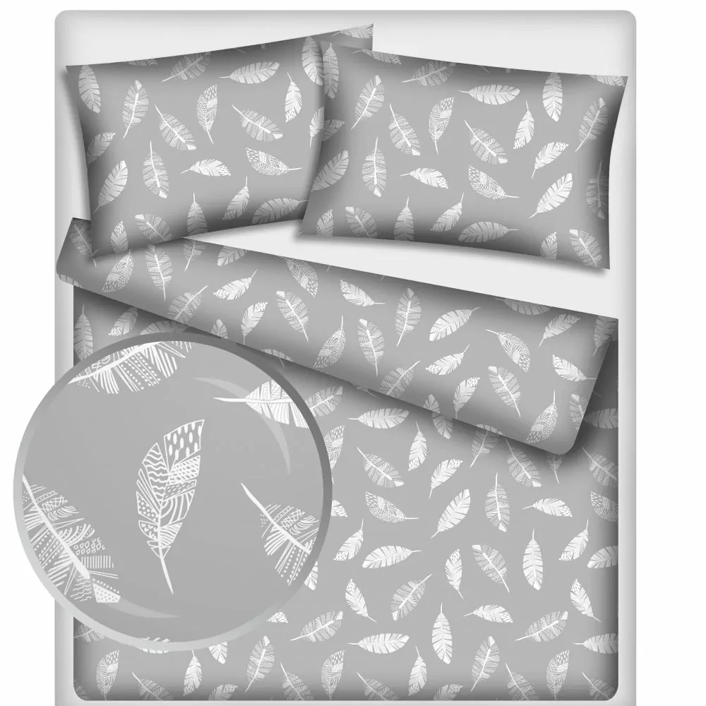 Luxusní povlečení ze 100% měkčené bavlny. Materiál ve velmi vysoké jakosti, bavlna je jemná a hladká. Povlečení zdobí bílá pírka na světle šedém podkladu.