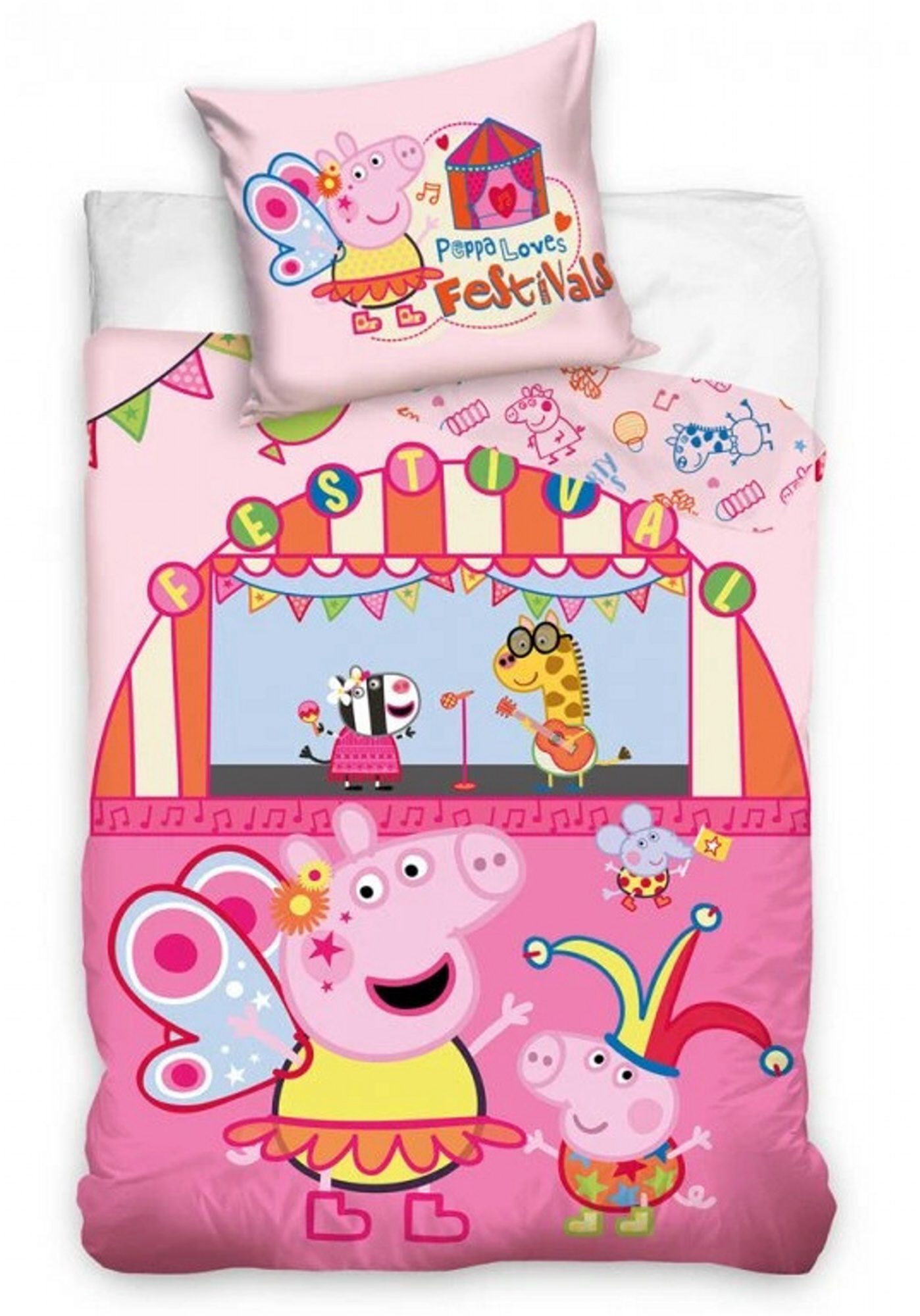 Dětské bavlněné povlečení s obrzákem populárního prasátka Pepiny. Povlečení je oboustranné, z jedné strany je Pepina a Tomík, z druhé strany miniatury. Povlak na polštář je z obou stran stejný, viz. foto.