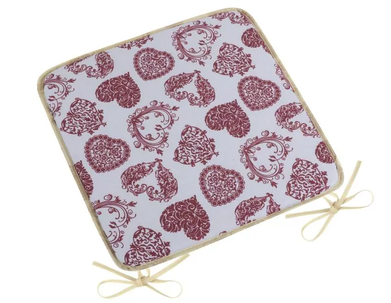 Tento sedák s hladkým povrchem je vybaven šňůrkami, které slouží k pevnému přichycení. Uvnitř se nachází polyuretanová výplň o výšce 2 cm, která poskytuje pohodlné sezení. Sedák je prošitý okrasným stehem, který zabraňuje posunu vnitřní výplně. Lze ho snadno vyprat v automatické pračce na 30°C. Vzor sedáku představuje krajkovaná srdíčka ve vínové barvě na šedém podkladu.
