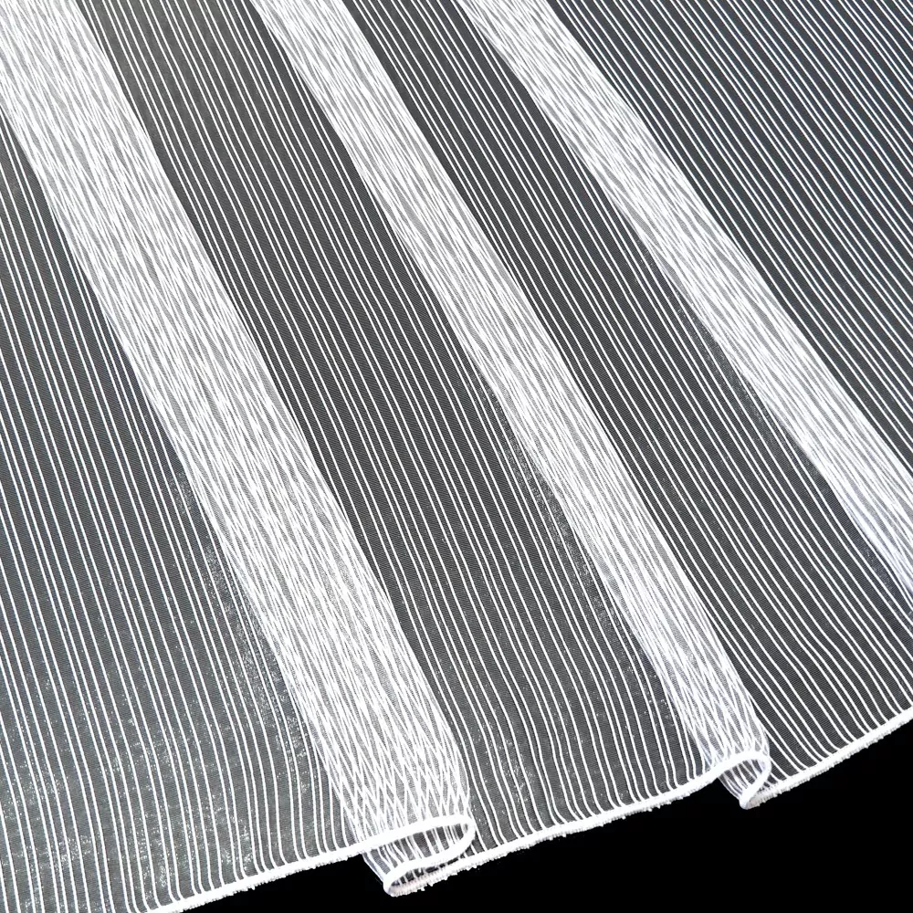 Elegantní bílá záclona s efektivními pruhy a mírným leskem. Díky pruhům působí záclona netradičním dojmem. Na spodním okraji je zakončen zátěžovým olůvkem, které zaručí nekroucení záclony. Dlouhé bílé záclony jsou velice oblíbené díky svému modernímu a elegantnímu vzhledu. Skvěle se hodí do obývacích pokojů či ložnic.