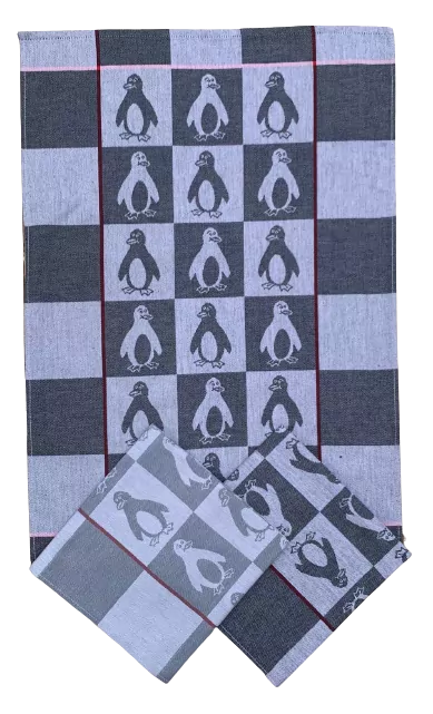 Sada tří bavlněných žakárových utěrek se vzorem tučňáků.