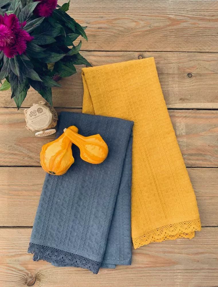 - Vaflové utěrky s krajkou 50x70cm 2ks - OKROVÁ A ŠEDÁ