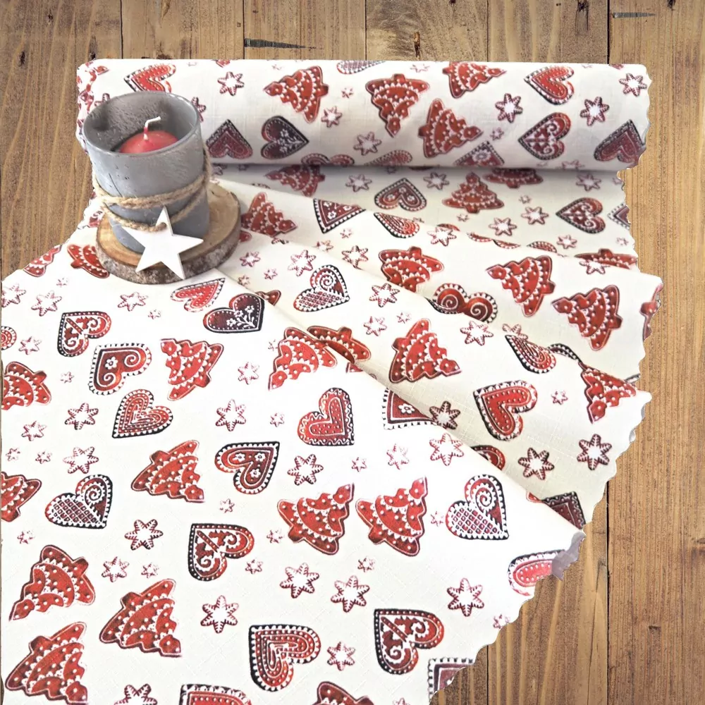 Vánoční běhoun s teflonovým povrchem a perníčkovým motivem jsou tím správným kouskem pro váš vánoční stůl. Díky své teflonové úpravě jsou tyto ubrusy odolné vůči jakýmkoli nepředvídatelným situacím, které se mohou při vánočním večírku stát. Pokud se něco vyleje, nemusíte mít obavy - tekutiny se nevstřebávají, zůstávají na povrchu ubrusu a dají se snadno setřít ubrouskem nebo utěrkou. Tato schopnost však neplatí pro mastnotu.