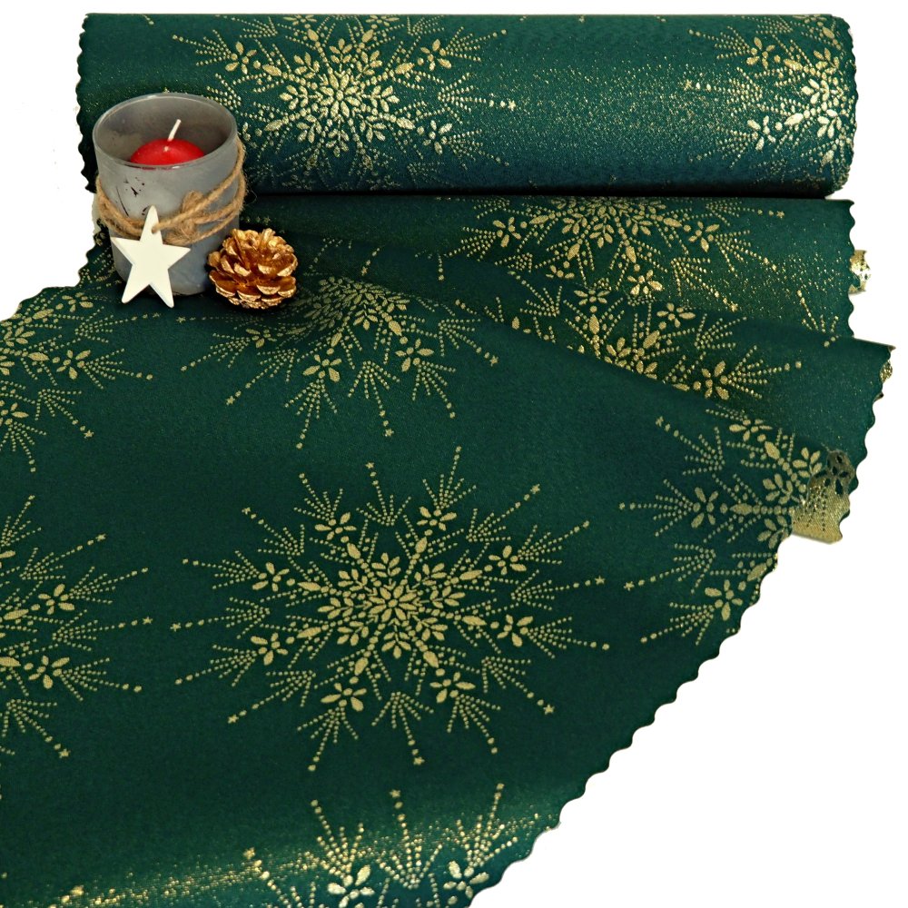 Vánoční běhoun v metráži VLOČKY zlaté na zelené
