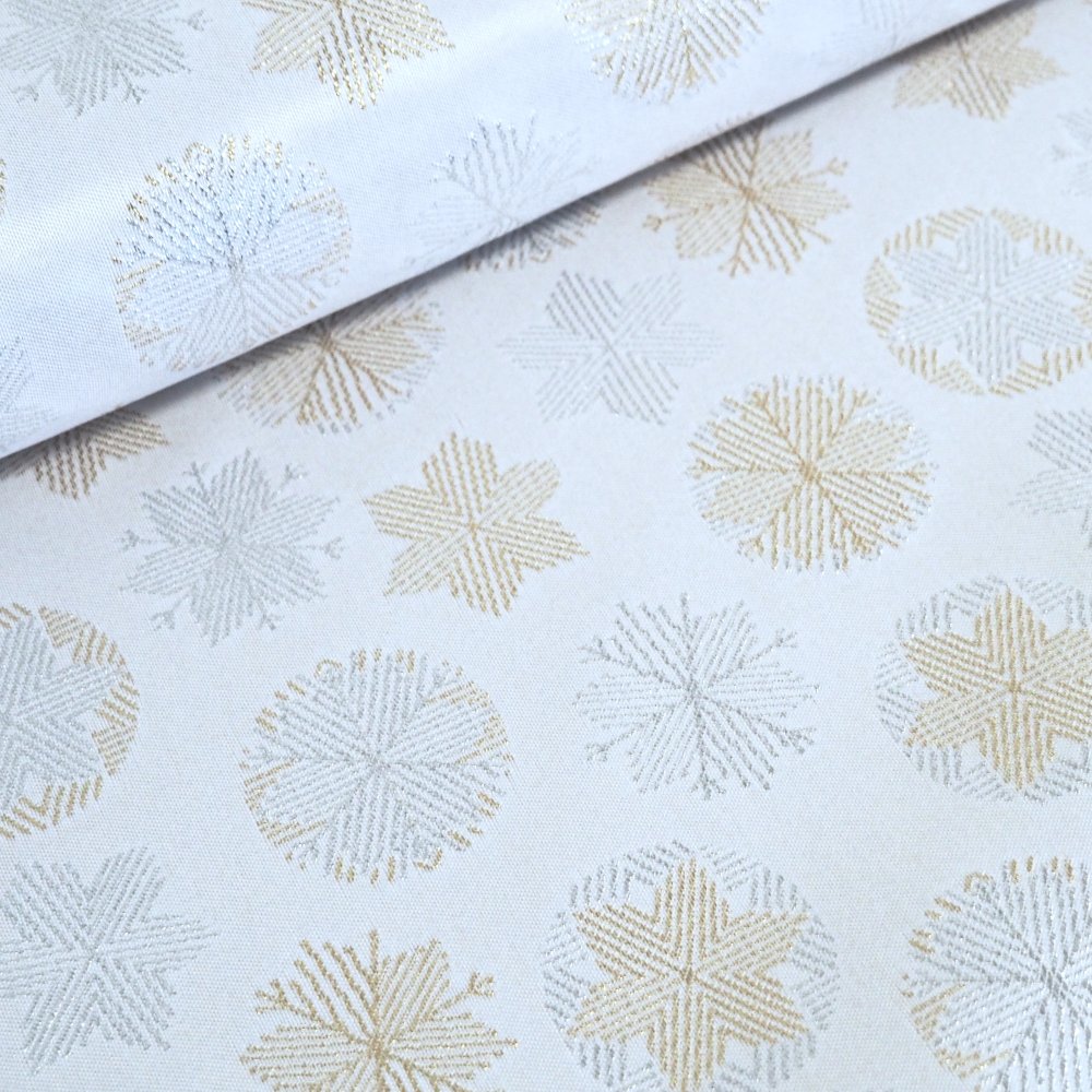 Tato ubrusová látka vyniká svým oboustranným vzhledem – hlavní strana je bohatě zdobená vánočními motivy sněhových vloček na bílo-zlatém podkladu s lesklou lurexovou nití, zatímco druhá strana je jemnější a působí decentně elegantně. Díky odolnosti a dlouhé životnosti je ideální jak pro domácí stolování, tak i pro vánoční večírky a gastronomické provozy.
