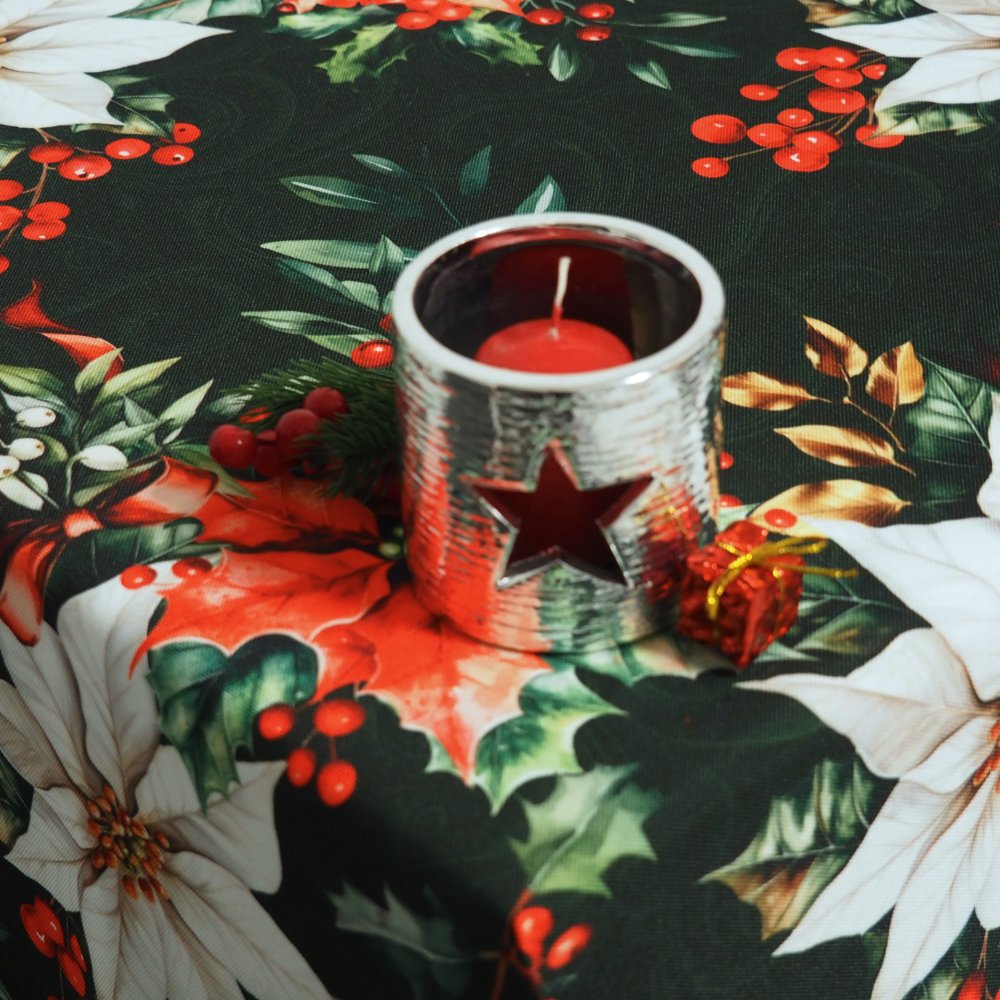 Vánoční ubrusy a běhouny se zeleným motivem vánoční růže. Odolný polyester s vodoodpudivou úpravou, krásné vlnkové okraje a snadná údržba. celý popis