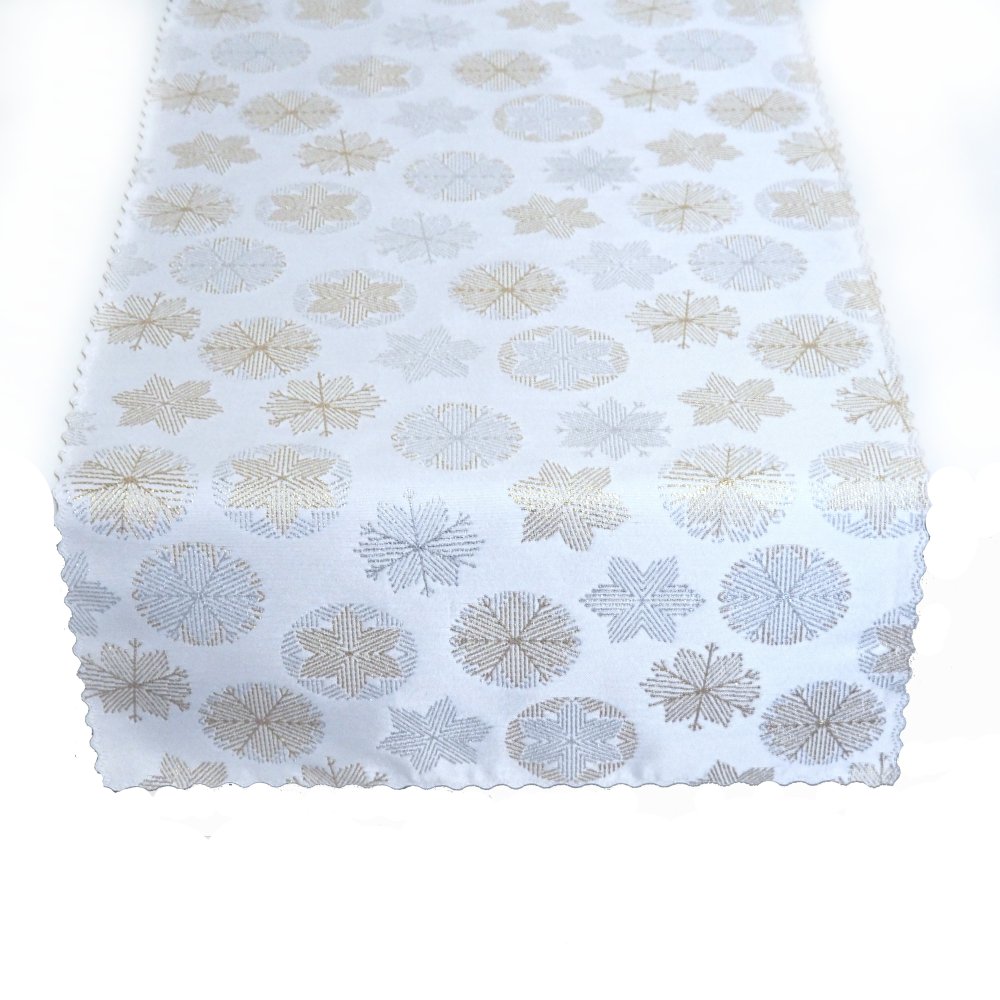 Velkou předností je oboustranný vzhled – hlavní strana je bohatě zdobená vánočními motivy sněhových vloček na bílo-zlatém podkladu s jemnou lurexovou nití, zatímco druhá strana působí decentněji, ale stále velmi elegantně. Díky délce až 12 metrů jsou tyto běhouny ideální pro dlouhé slavnostní stoly a rauty během sváteční sezóny.