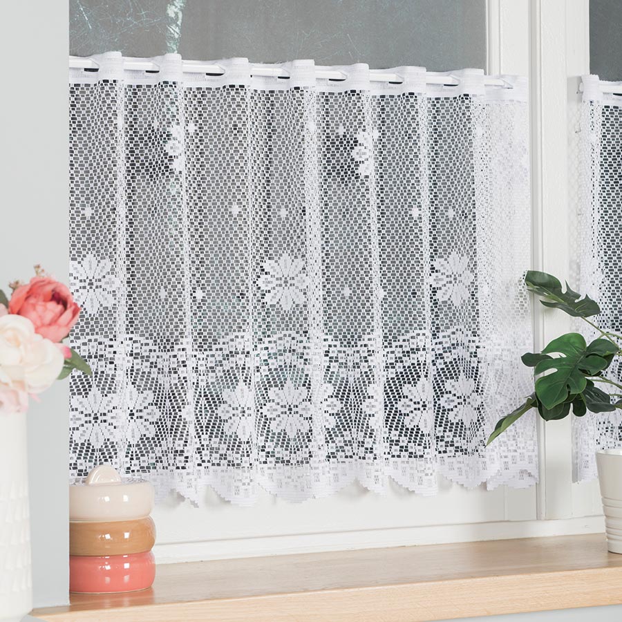 Upozornění: při objednání vitrážových záclon v metráži stříháme přesně na požadovanou délku, takže se může stát, že střih povede přímo očkem. Pokud si však zvolíte naši úpravu, například obšití boků, zajistíme, aby záclona končila vždy celým očkem.