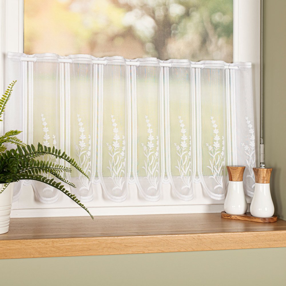 Bílá žakárová vitrážová záclona s motivem levandule – jemná dekorace do kuchyně