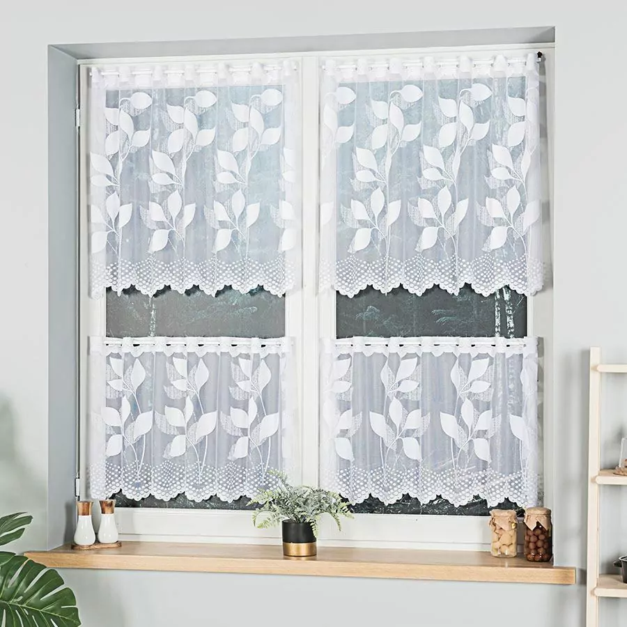 Bílá žakárová záclona s elegantním floristickým vzorem. Vzor zdobí celou plochu záclony a na jejím dolním okraji je zakončen dekorační puntíkovou bordurou. Pro pohodlné zavěšení má záclona výšky 50 cm, 70 cm a 110cm očka (o rozměrech 3x1 cm), takže není potřeba našívání řasící pásky. Pokud si přejete vytvořit luxusní nařasení záclony u jiných výškách, doporučujeme zvážit možnost našití řasící stuhu. Tato záclona se skvěle hodí do obývacích pokojů, ložnic a kuchyní, aby vaše interiéry získaly nádech elegance a krásy.