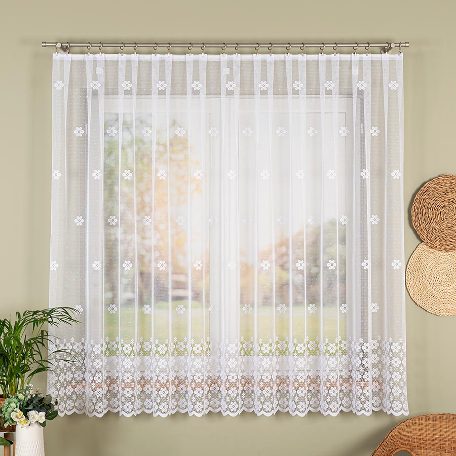 Zpříjemněte svůj interiér touto dekorativní květinkovou záclonou, která zaujme svým výrazným vzhledem. Díky bohaté spodní borduře a zakončení ve formě ozdobných vlnek působí na okně velmi elegantně a efektivně doplní vzhled místnosti.