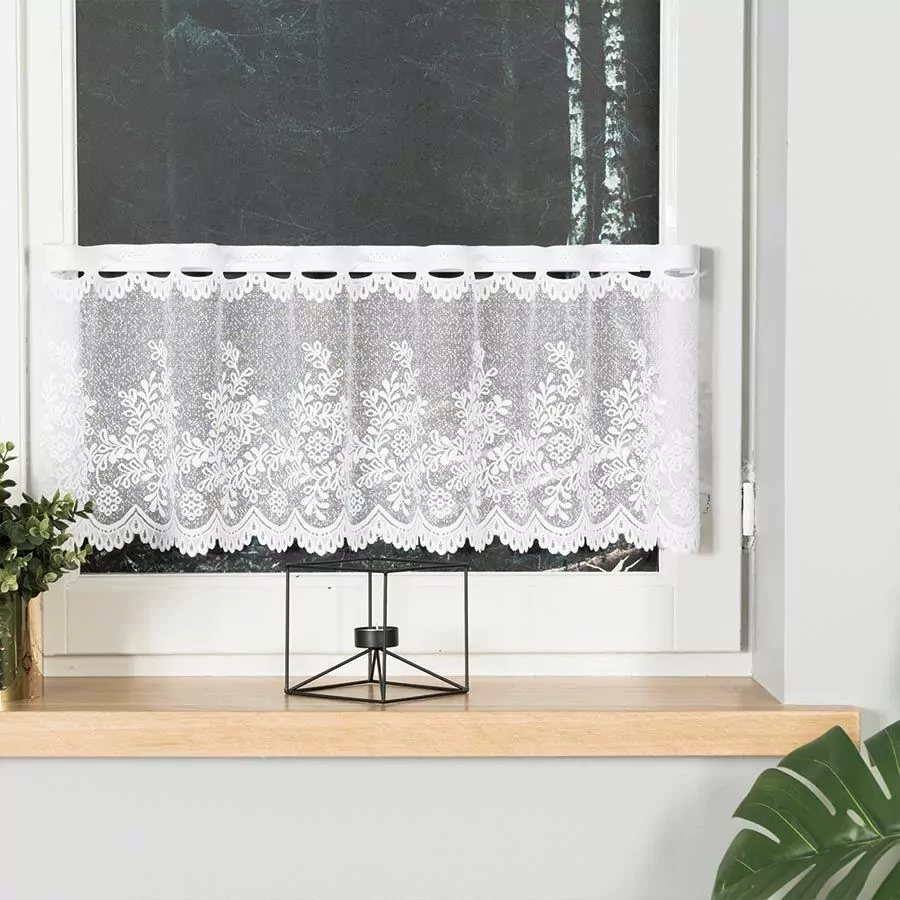 Bílá žakárová záclona s floristickým vzorem přináší do vašeho prostoru elegantní atmosféru. Vzorek zaujímá celou plochu záclony a je doplněn výraznou spodní bordurou. Pro pohodlné zavěšení jsou výšky 30, 45, 60 a 90 cm vybaveny očky, takže není nutné na ně přišít řasící pásku.